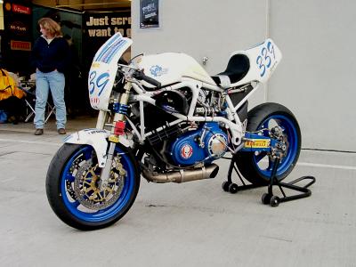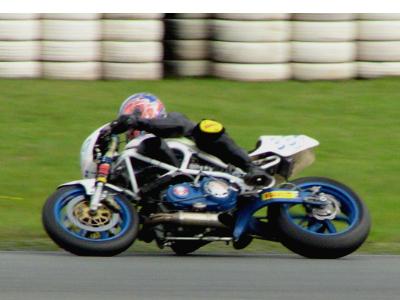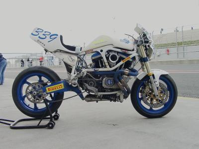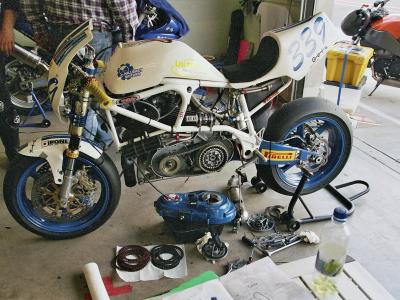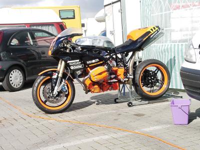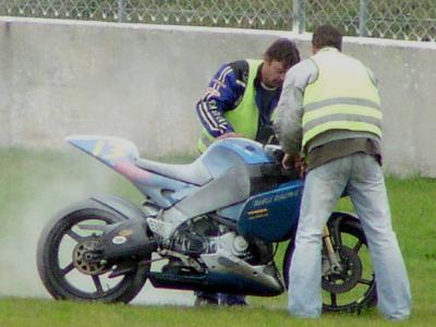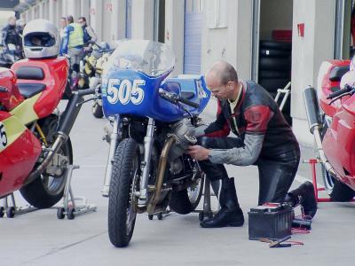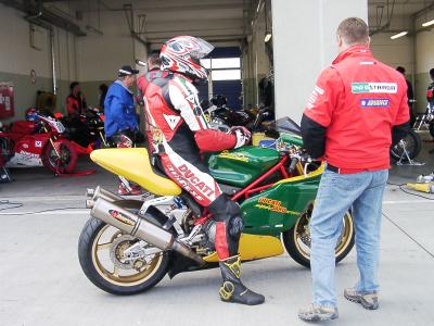 Das weiß/blaue Happening sollte auch in diesem Jahr die Saison beschließen. Nach einem weiteren Problemwochende mit unzähligen Abstimmungsversuchen beim Festival Italia hatten wir den Motor zerlegt und einen Materialfehler an einem Ventilsitzring des hinteren Zylinders feststellen können. Bei dieser Gelegenheit verbauten wir den eigentlich erst für 2006 geplanten 1200cc