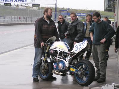 und kurz später sind wir wieder Raceready. Inzwischen ist Buell Hannover angekommen. Knuth Toppel und Volker Schirmer haben für die Pro Thunderklasse gemeldet. Wie wir bereits im Vorfeld hörten wird Hannover im Frühjahr in Daytona starten und hat hierfür keinen geringeren als Rico Penzkofer verpflichtet. Der wird nun in der Sound of Thunder Klasse auf Dirk Scheffer mit der von
