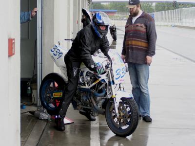 Europarekordfahrer Stefan Graff mit dem Harley Streetdragster. Das Wetter verhieß nicht wirklich Gutes und so kam es das wir Donnerstags erst einmal mächtig im Regen standen. Keiner hatte rechte Lust die Bikes einzusauen, aber nachdem es nicht aufklaren wollte halfen nur Regenreifen und raus! Der Boyracer, nun mit offenem Trichter, lief auf