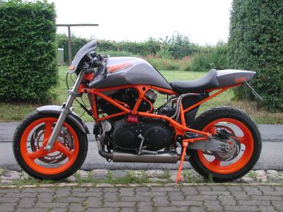 Das Heck welches am Prototyp noch aus Aluminium hergestellt ist werden wir nun bald in GFK anbieten, es ermöglicht eine schlanke Linienführung ohne den Rahmen, wie beim Verbau des S1 Hecks, kürzen zu müssen. Unser zugegeben voluminöser aber eben auch sehr leistungsfähiger Aluluftfilter in Verbindung mit dem Luckys Raceauspuff sind weitere Features deren Zusammenspiel wir an diesem Motorrad perfektioniert haben. |