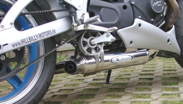 So ist es auch gelungen ein angenehm kerniges und dumpfes Auspuffgeräusch im Stand und unteren Drehzahlbereich zu erhalten. Mit den ABE Einsätzen verschlechtert sich im mittleren Bereich zwischen 4.000 und 5.000 U/min die Drehmomententfaltung. Weiteres Ergebnis unserer Prüfstandsläufe ist der Sebring Twister Race Schalldämpfer der mit geänderten Endrohren und speziellen Einsätzen von uns auch auf der XB 12 bereits sehr erfolgreich getestet wurde. Der Twister kommt fix und fertig zum einfachen Anbau, bei 12er Modellen entfällt das Klappensystem, incl. Haltepunkten für den Motorspoiler.