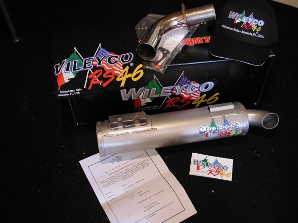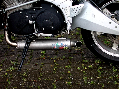 aus. Der Wileyco RS 46 ABE Schalldämpfer wird am Anschraubpunkt des Seitenständers und hinten am Motor befestigt. Eine Halterung für die Montage des Motorspoilers ist optional lieferbar. Man arbeitet bei Wileyco z.Zt. an der Entwicklung des ABE Schalldämpfers für die XB 12 Modelle, dieser wird als Doppelschalldämpfer ausgeführt und ab September 2004 lieferbar sein. Der RS 46 kommt als Bigpack in einer Box mit T-Shirt und Kappe komplett mit allen notwendigen Kleinteilen für die Montage. |