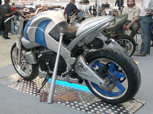Das allein wäre aber doch etwas zu einfach gewesen. Mächtige Sharkfinns über Rahmen und Tankcover gezogen geben dieser XB9S den ganz besonderen Kick. Für den notwendigen Nachdruck sorgt nicht nur Daisy der Baisy sondern auch der an diesem Motorrad erstmals gezeigte Prototyp des Sebring “TWISTER”. |