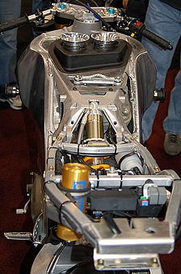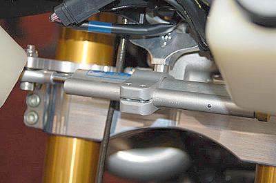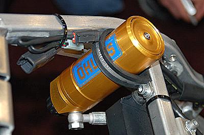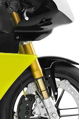 Buell equipped the “Double R” with Öhlins Suspension components. The 43 mm, titannitride coated “Road & Track” frontfork is multi adjustable (12 click rebound, 10 clicks compression, 10mm preload adj.) and is holded by CNC milled triples with triple clamp on the lower. On the rear also first class Öhlins take care (rebound 15 clicks, compression 14 clicks, preload adj. 20mm). A Highlight is the frontside mounted 16x adjustable Öhlins SD steeringdamper. |